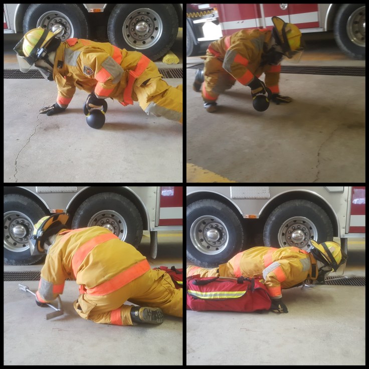 Probies are a wonderful group. I called one of ours to come up to the station where he got into full gear (minus the SCBA), I grabbed a kettlebell from my truck while he grabbed the RIT pack and a Halligan from our rescue truck. We pulled the squad out of the bay, and I showed him the Bear Crawl and Drag.